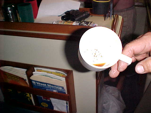 I fixed breakfast and made coffee. That was the last time they let me make coffee. No, that's not seagull poop. It was a beautiful day, weather wise. The weather had been perfect and would continue that way throughout the trip. We weighed anchor and set out to the north again. A few hours later the engine died again. We cracked an injector and found we were pumping air. I know we have lots of fuel. In fact there is the odor of diesel everywhere and a small drip is coming from the vent for the port tank. We've got the selector valves set to supply from the port tank and return to the port tank. If I didn't know better I'd think we were manufacturing fuel. Something seemed strange. We cranked it up again after bleeding and went on a bit, and it died again. We pulled the line from the output of the electric fuel pump and found that it wasn't pumping. We looked over at the shore and US 1 is running right along the ICW at this point. We can't tell, but it looks like a parts house is on the highway, so we decided to anchor and dingy in. It's about 10:30 and we're just south of Melbourne.