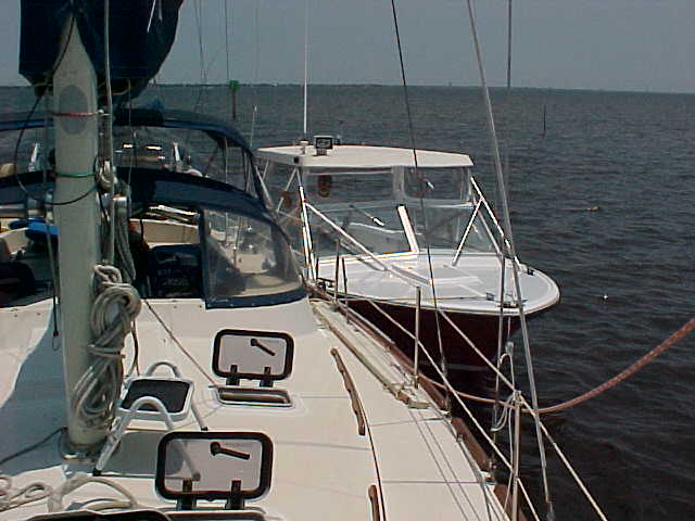 Off to Wind Angel to replace the fuel pump. On with the new, off with the old and away we go once again. But not for far. The engine died again. Hm. Fuel filter looks OK. What the heck is going on? I started tracing the fuel hoses and found that the bloody fuel selection valves were plumbed entirely wrong. There was no way that they could work. No matter what you did, you couldn't put fuel into the starboard tank, but you could get it out of either. Stan, the plumber, replumped the valves in a jiffy and I started to pull fuel from the port tank. We were real familiar with bleeding procedures by this time. Didn't make it very far before we plugged up the fuel filter. We called for a tow, since we finally realized that the starboard tank was empty and since the filter was plugged, I didn’t trust the port tank. Turns out a marina wasn't very far away, but Tow BoatUS came to the rescue.
