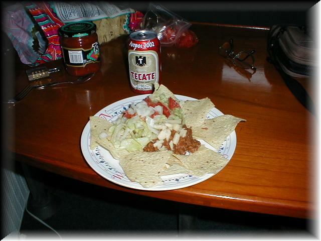 Arrange chips in a circle on a plate. Spoon meat/bean mixture in the middle. Top with cheese, vegetables and salsa.