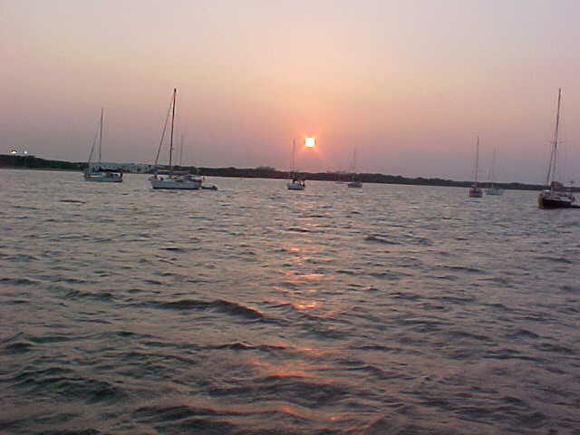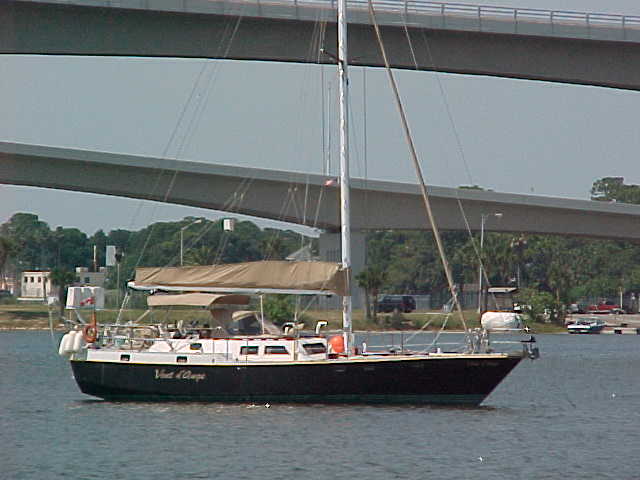 We woke to another glorious day. Too bad we were barely able to crawl. Somehow we got the anchor on board. No one was up for breakfast. Correction, no one was up for fixing breakfast. Long about 10:30 we had brunch instead. I went below to inspect the engine and to see how it was fairing. Engine was running fine, a little too much water coming in the packing, but better a bit too much. What is that strange thing? Oops, that's the rudder cable, but its guts are hanging out. Wish I had a picture to show you. The rudder cable runs through a conduit. The conduit ruptured and was bent in a 90 degree angle. The cable was sneaking out of one end of the break into the other end. I knew that wouldn't last very long at all. We pulled in at 7 Seas Marina in Port Orange. I found some replacement fuel filters for the Racor there. The very helpful staff located me a piece of 1/2" pvc tubing, cut off a foot or so and split it for me. I bought 4 hose clamps and wrapped said pvc around the broken conduit and clamped it into place. I think I earned the McGuyver tag for that one. We also borrowed a pipe wrench from them to tighten the packing nut. They have a policy of not lending tools so they accidently left the wrench laying on the dock beside the boat. We found it and returned it to them. I offered them hard cash for all the assistance, but they refused. Gary found a store and bought some more beer. Does anyone see a pattern here? Another very helpful marina to add to the list. I'm impressed. We found some sail tape there and proceeded to drop the genny. Uh oh, this genoa is held on by a zipper running the length of the forestay. Funny thing, the traveller is gone. It's come off somewhere. No way we're going to get this sail back on, so into the sailbag it goes. Nuts, no more sailing. Phil claimed that last night's excesses had nothing to do with the fact he slept from about 1:30 to 6PM. Yeah, right. The engine had also died once on the way up so I surmised that maybe the new fuel pump didn't have enough output. I've since come to realize that the pump isn't necessary and that some combination of gravity and the injector pump will suffice. So I have no idea why it quit, but that was the last time it stopped. We put the old pump back on. A couple of hours later I was hearing a squeak. I guess everyone else was deaf by that time and told me I was hearing things. I couldn't locate the noise so I ignored it for a while. I noticed that the alternator had stopped charging, the tach was squirrelly and the temp was increasing. Stan went down and confirmed that the belt was loose. We shut the engine down and tightened the belt. Perhaps they will believe me the next time I hear a noise. Maybe we made 50 miles today.